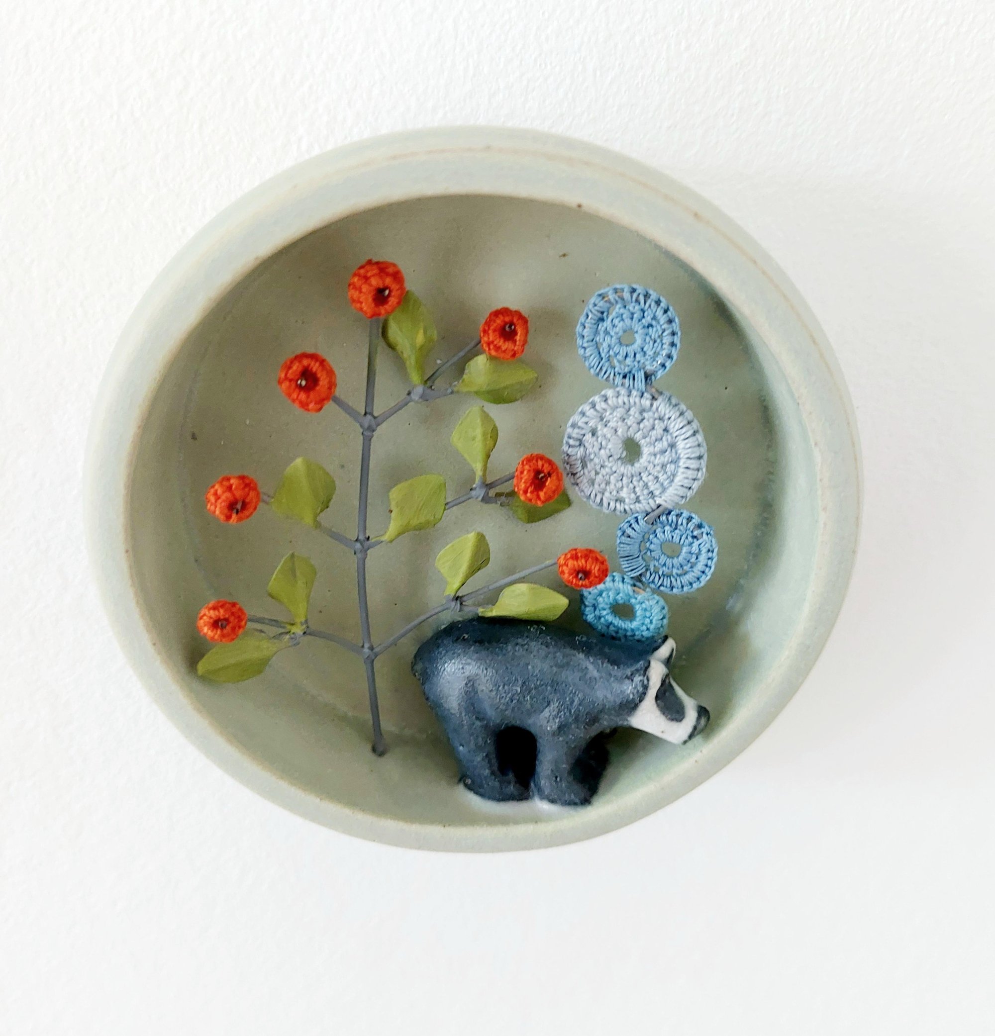 A small circular ceramic frame houses a ceramic badger, nestled within an intricate habitat formed from delicate wire work and crochet.