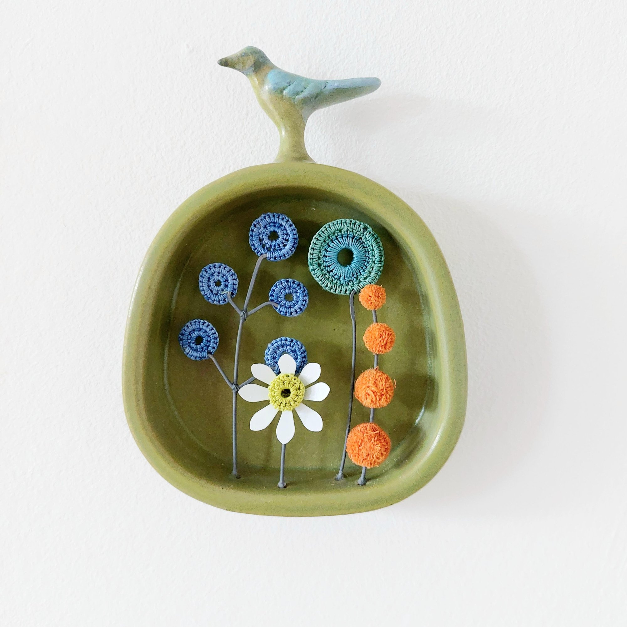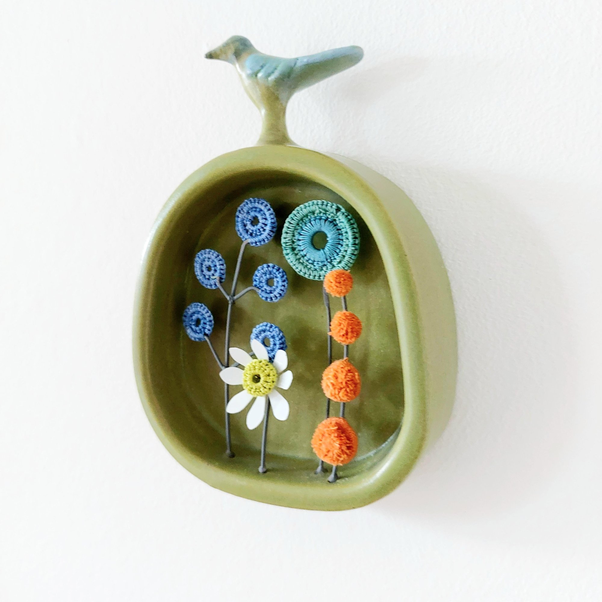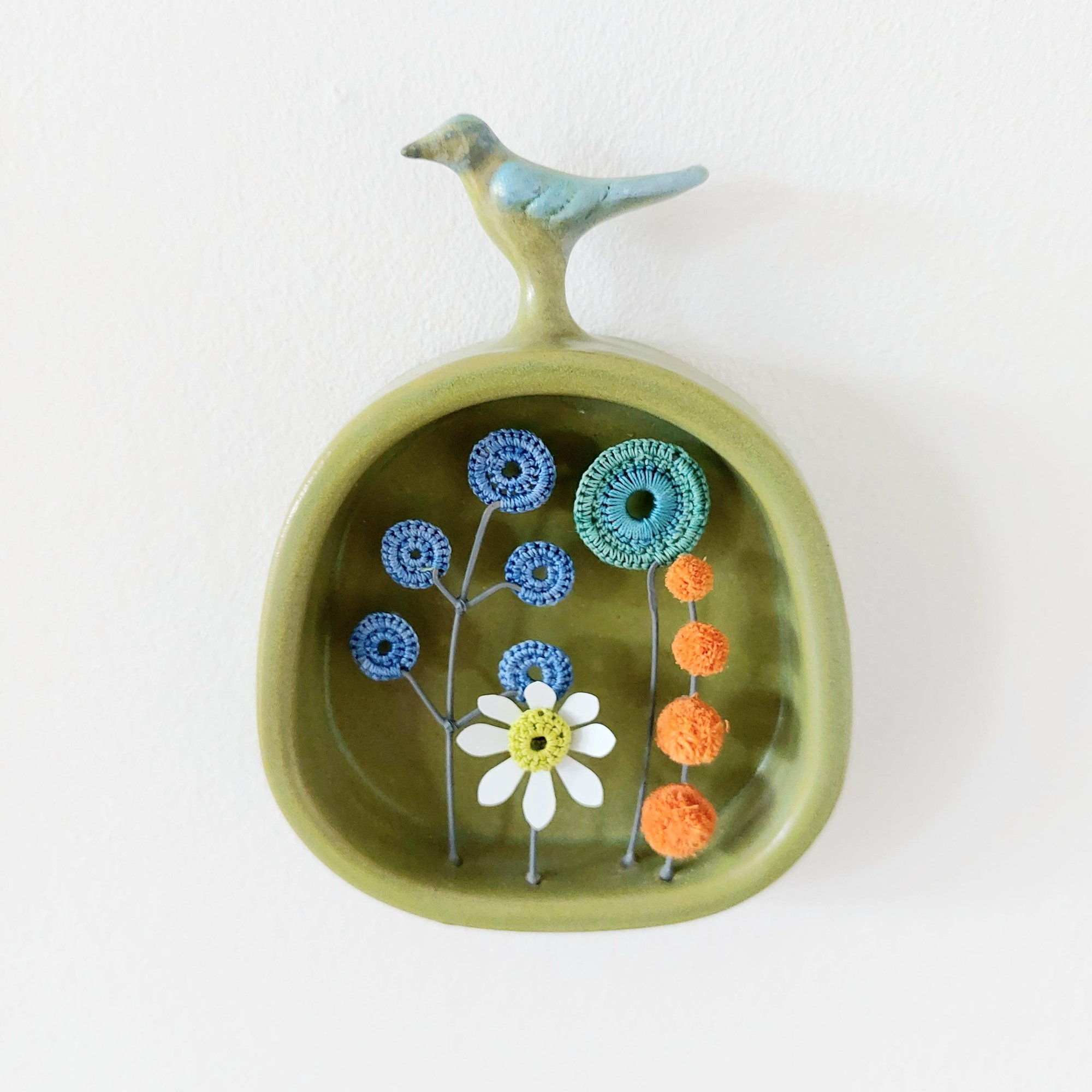 A small hand-crafted ceramic bird perches atop an arch-shaped ceramic frame. Within the frame, fine wire work embellished with delicate crochet creates its habitat.