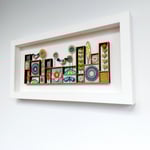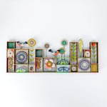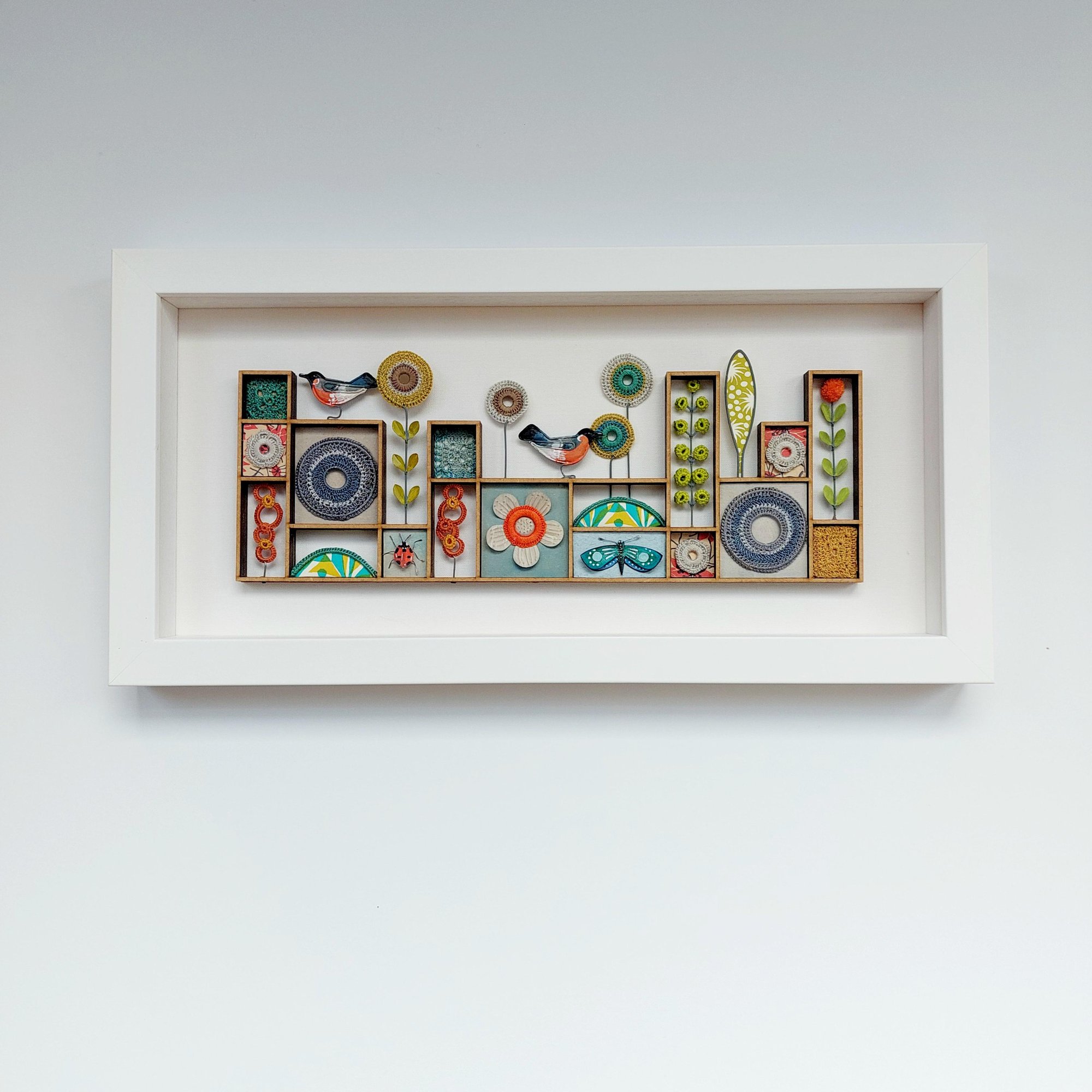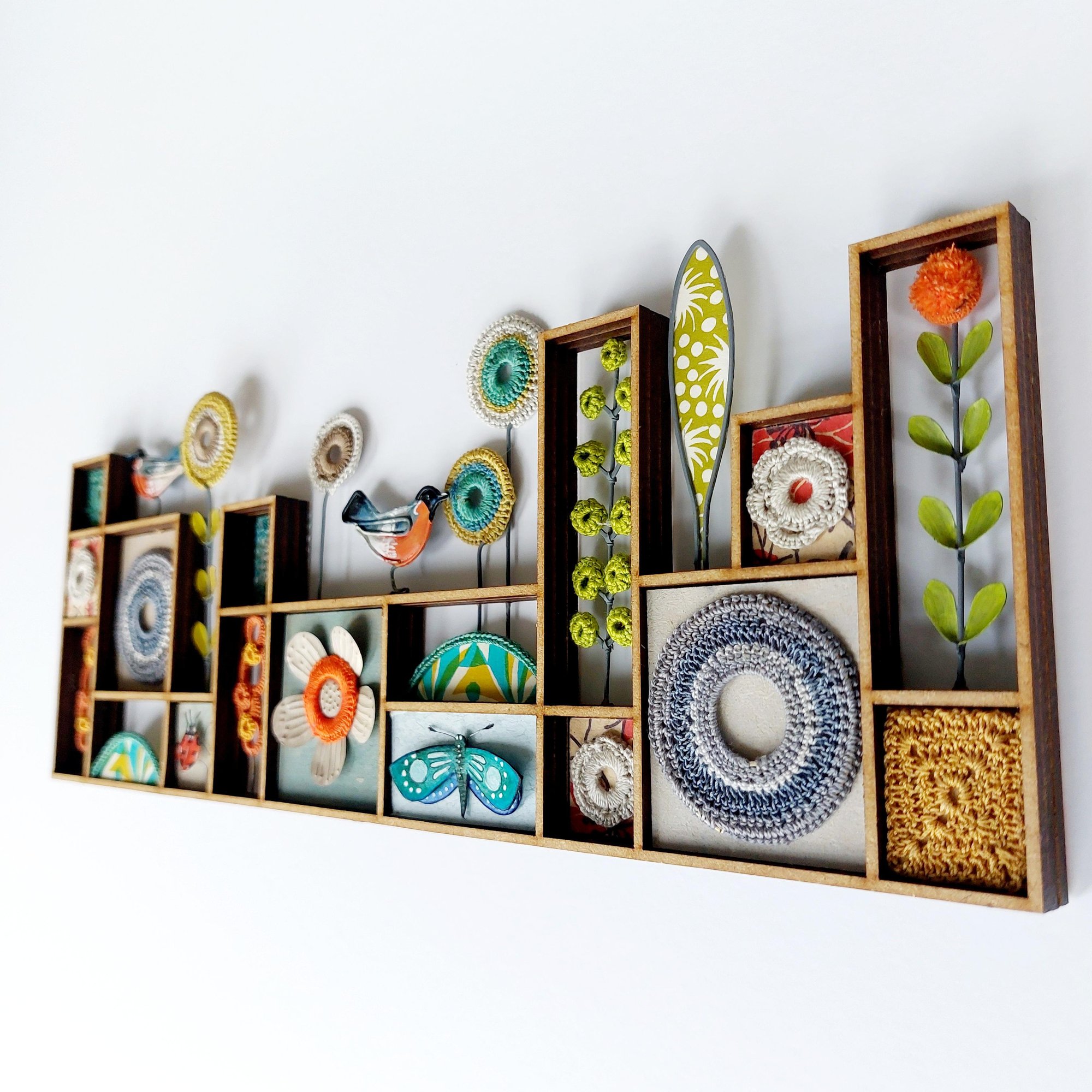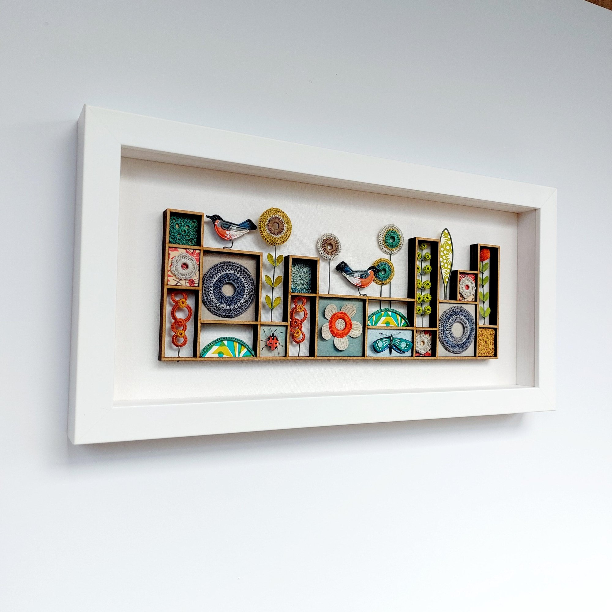 This Garden wall houses compartments for small intricately handmade explorations of nature. They are made from a range of processes; crochet using hand dyed threads, small hand painted paper moths & insects, wire and metal work shaping flower forms.