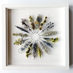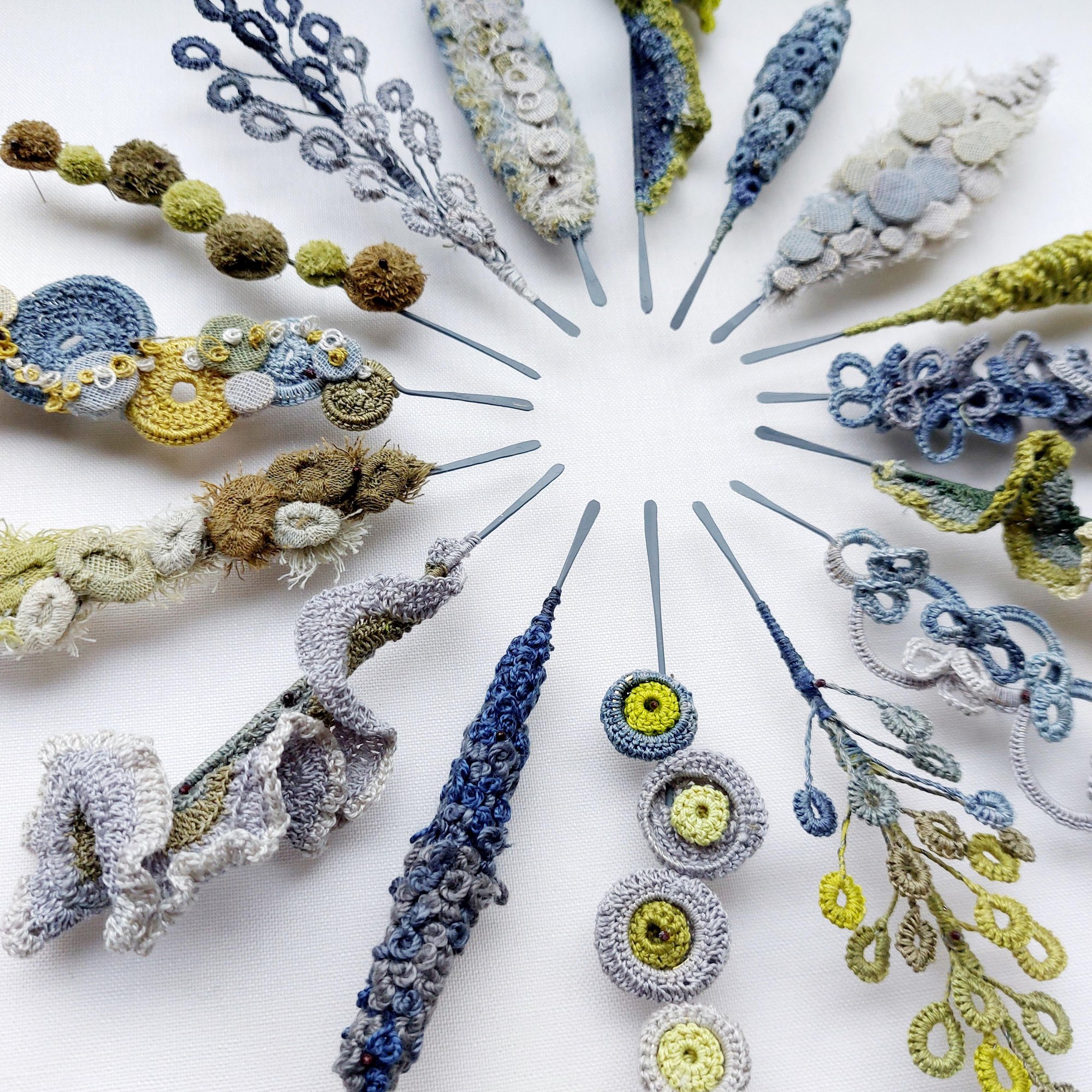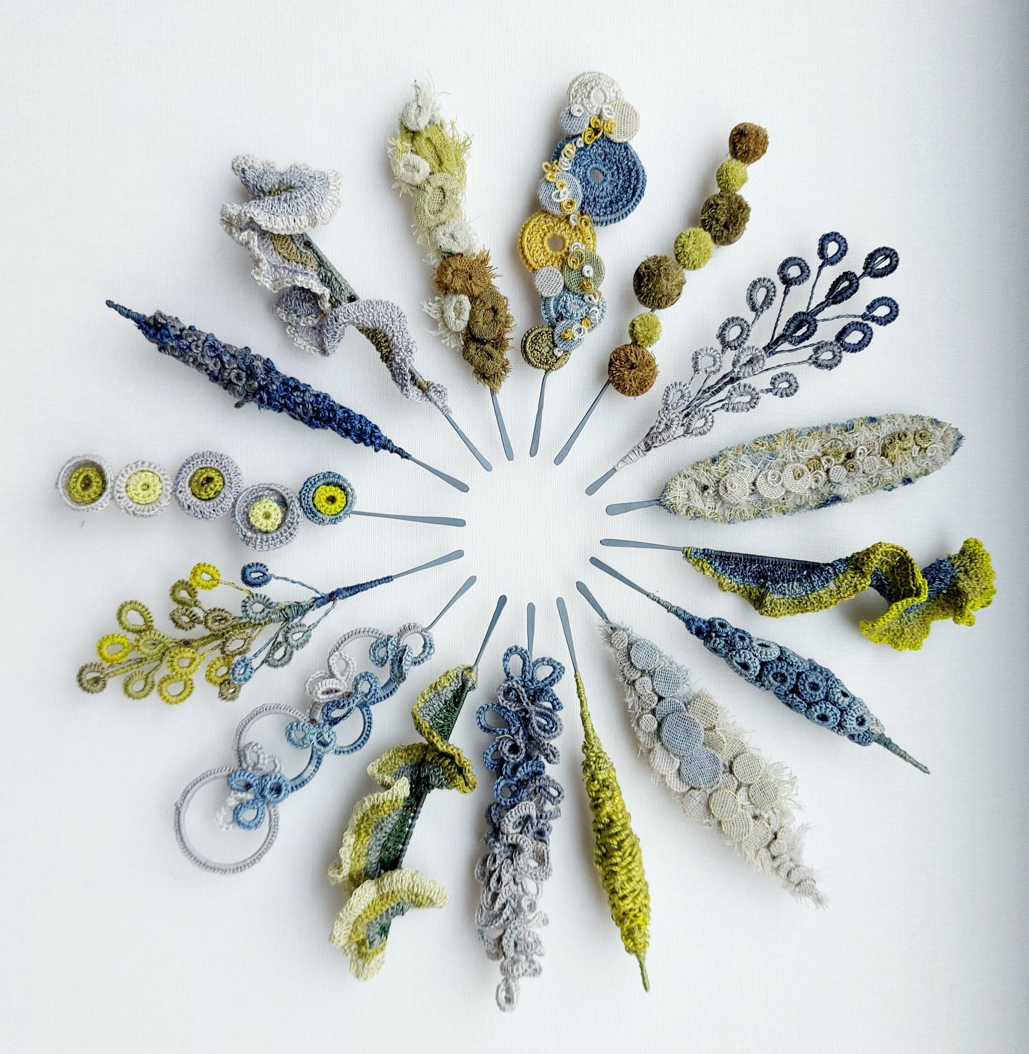 A textile circle is created from small individual intricate explorations, each one has been informed by textures, shapes and colours observed within nature. They are made with hand dyed threads using a combination of embroidery and crochet.