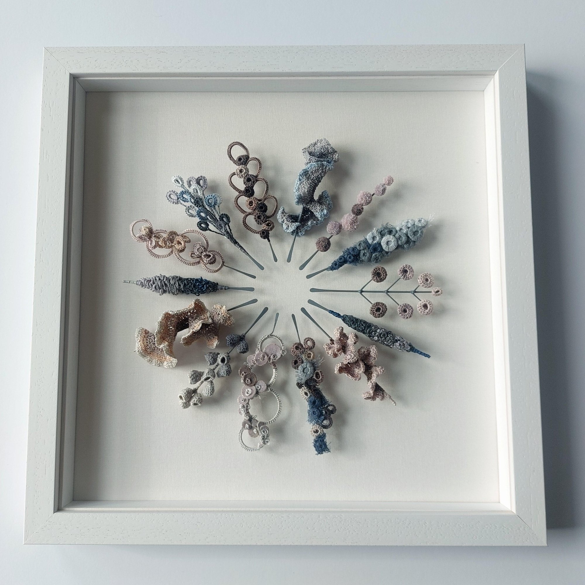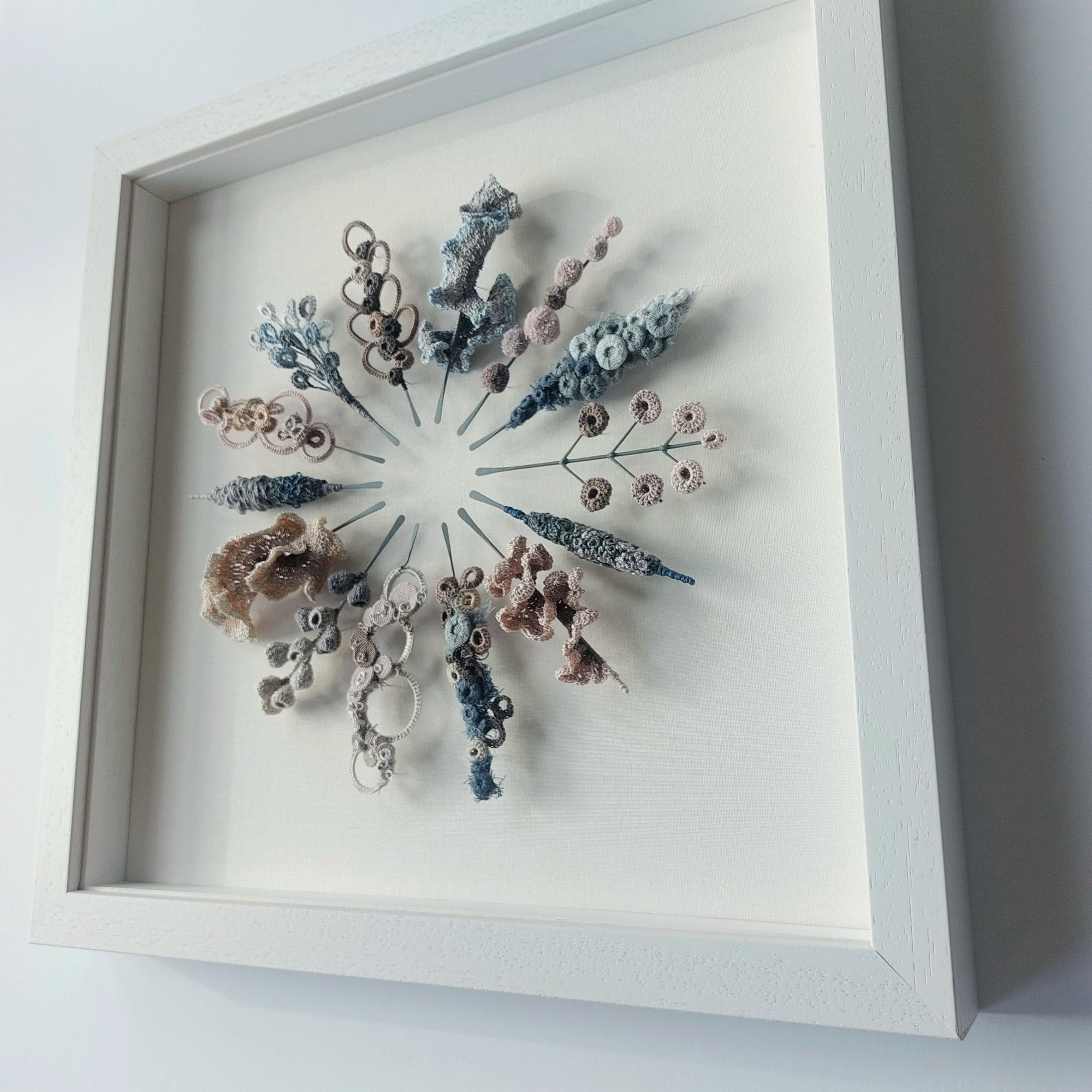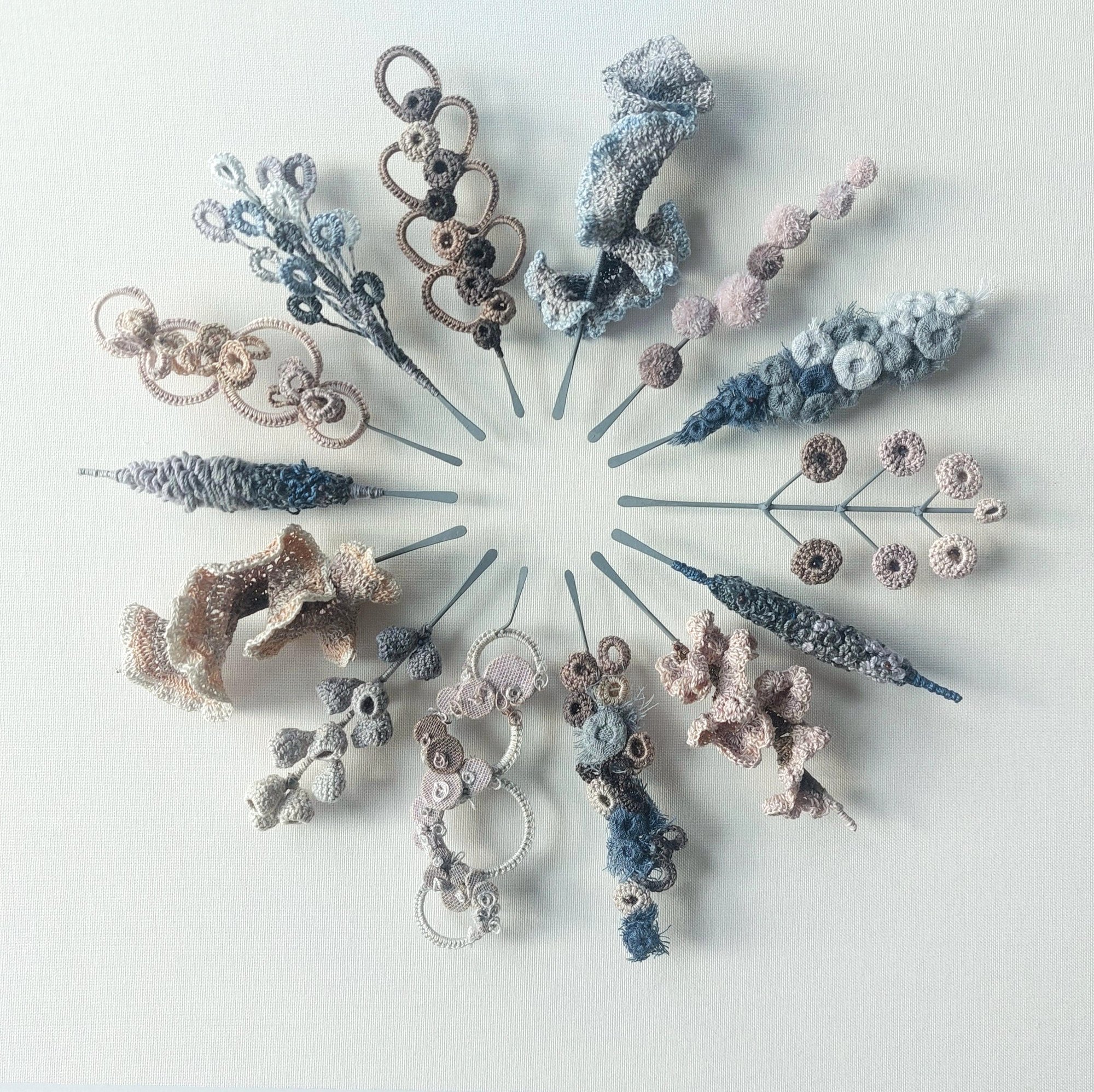 A textile circle is created from small individual intricate explorations, each one has been informed by textures, shapes and colours observed within nature. They are made with hand dyed threads using a combination of embroidery and crochet.