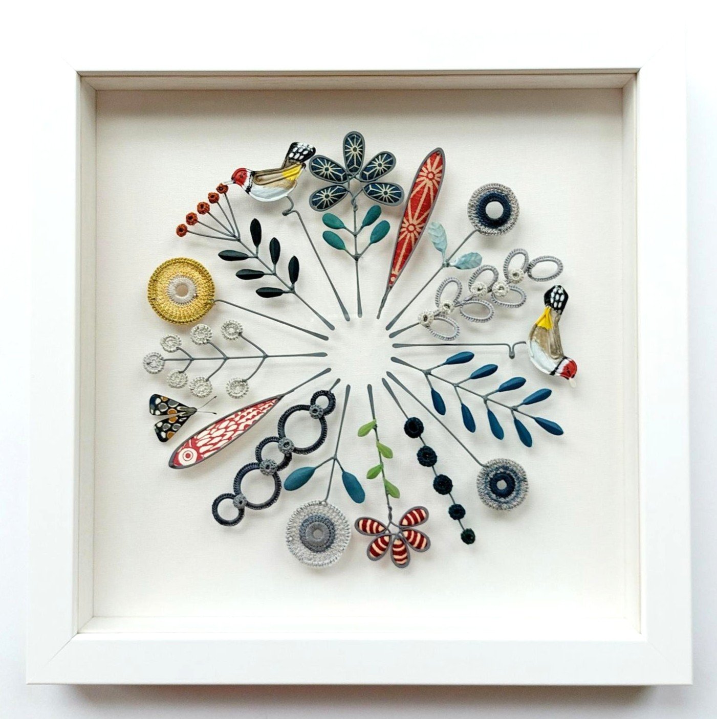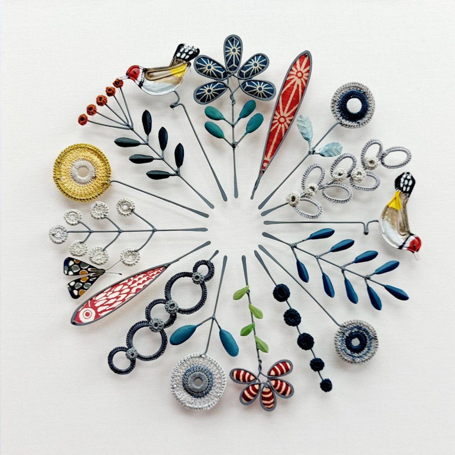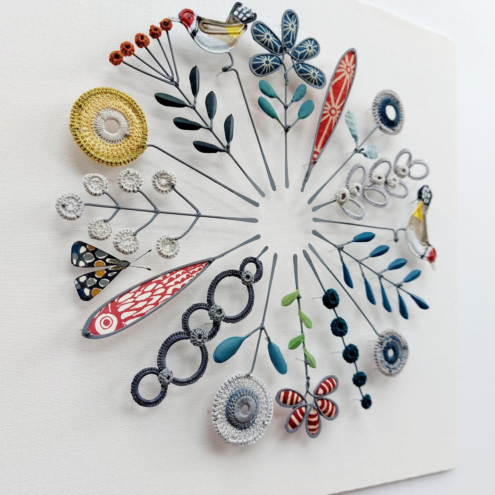 A small world of handmade wire forms embellished with crochet, fabric and metal to create a home for two Woodpeckers.