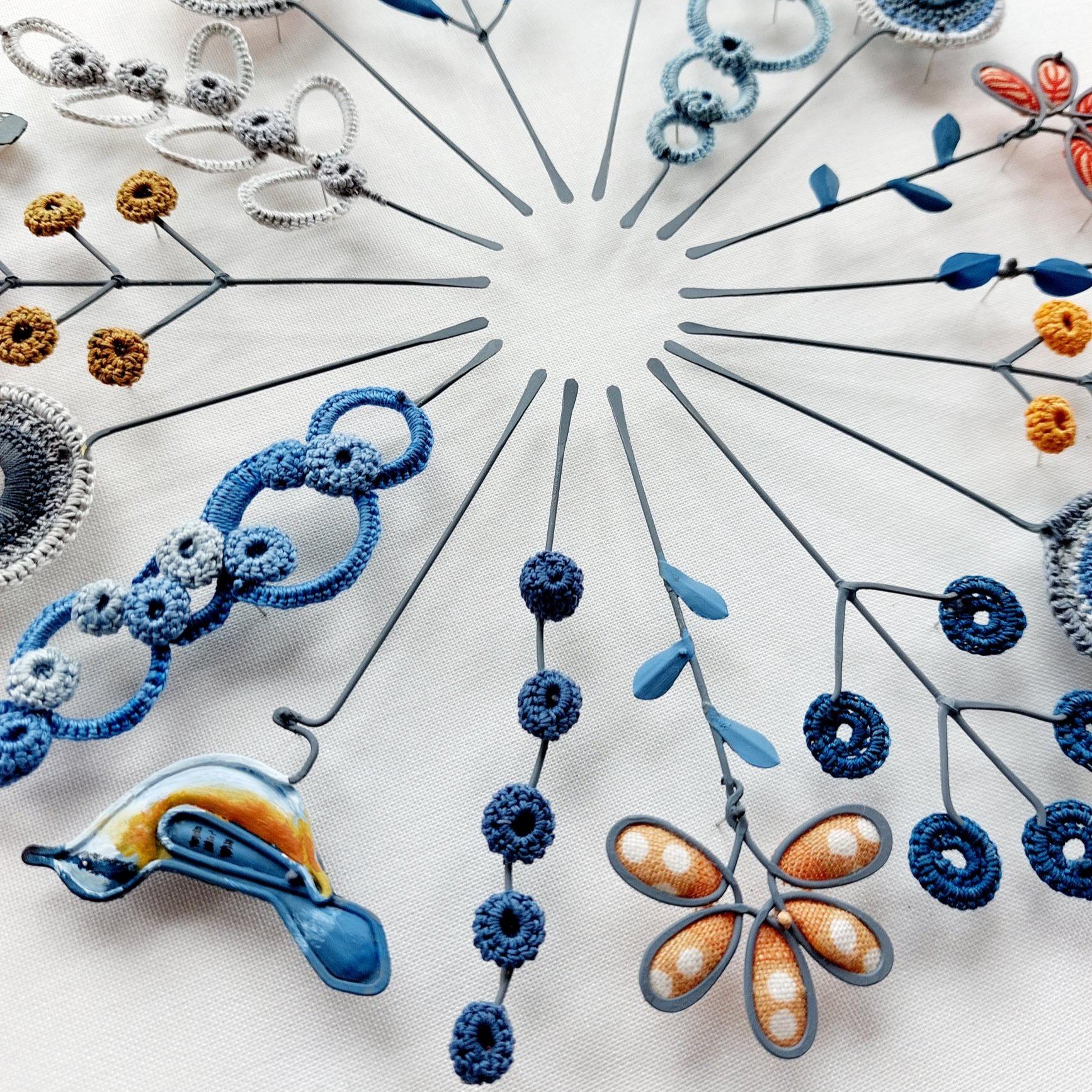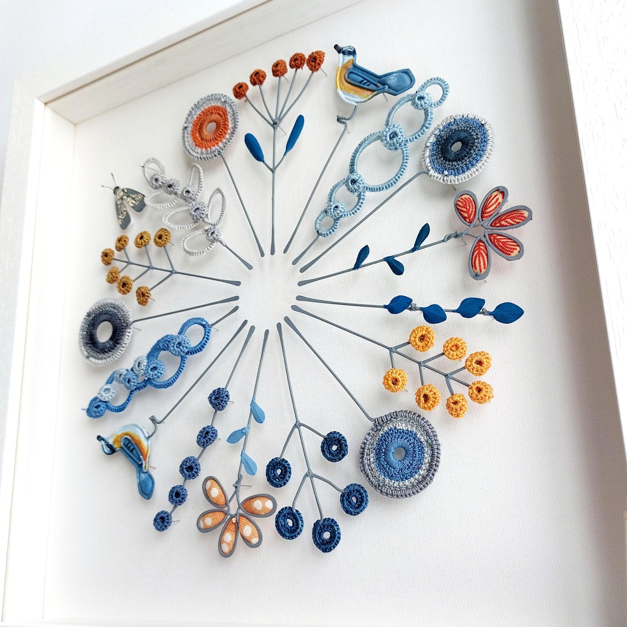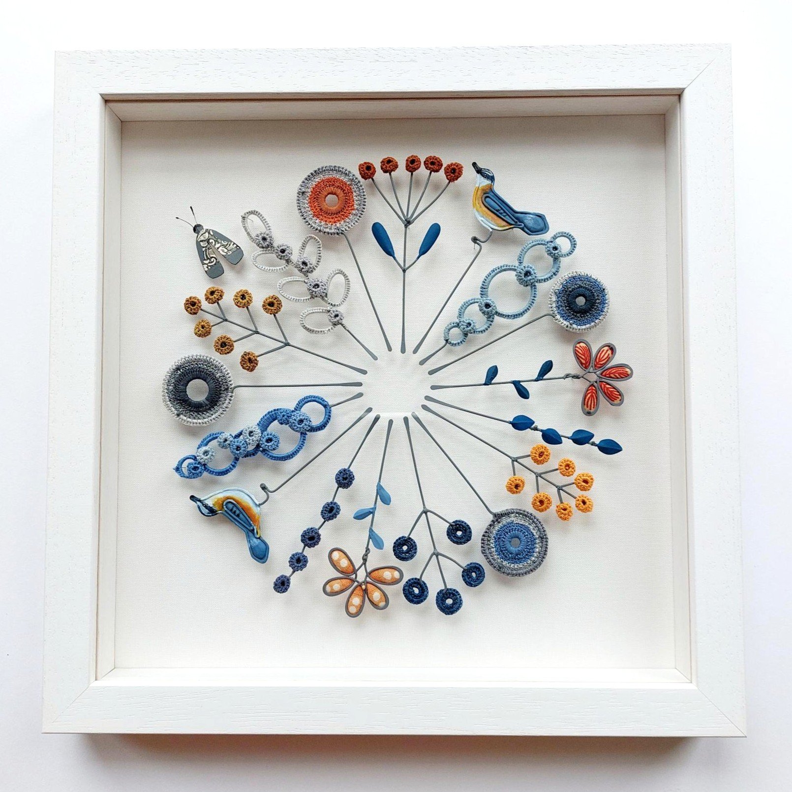 A small world of handmade wire forms embellished with crochet, fabric and metal to create a home for two Nuthatches’